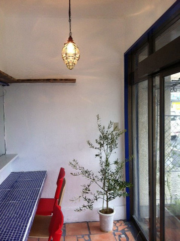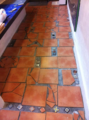 正方形のタイルを床に並べ、時にはタイルを割って破片を並べたり、所々にメキシコタイルという絵柄のついた小さなタイルを並べたりととても楽な作業でした。