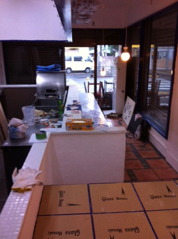 次はカウンター及びテーブルにモザイクタイルを敷き詰める作業です。