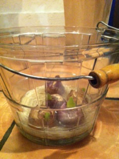 ヒヤシンス君は、夜は店内に入れてあげるよ。ひいきしてるから他の春球根達より早く花が咲く。予定。