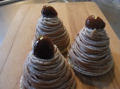 土台はメレンゲを使用します。モンブランは栗のペーストを使用しまき上げます。もう一つはモンブランの応用で、栗ではなくサツマイモを使用します。オーブンで焼き上げたサツマイモをペースト状にした後、西尾産抹茶を混ぜ合わせメレンゲの台に絞っていきます。抹茶が香り、サツマイモのほのかな甘みが楽しい、面白いモンブランです。