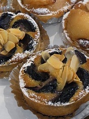 写真はナガノパープルとアーモンドのタルト。私のお気に入りタルトの一つです。巨峰ほど渋みもえぐみもなく、火を入れてもジューシーで美味。アーモンドとの相性も抜群で、とても美味しいタルトになっています。シャインマスカットと並んで今の旬で、売れ筋タルトです。こちらもぜひお試し下さい!