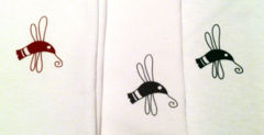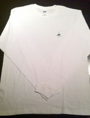 白の長袖Tシャツ、胸にオオスカシバのワンポイント。色は、赤、緑、グレーの三色。