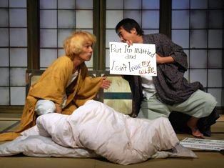 This production is a transition between realities and ideas. The characters come and go on the border of life and death. Amano has brought Yaji and Kita and the essence of the classical novel to life. Amano has not only tackled life and death, but also reality and illusion. He boldly crashes the fourth wall by having food delivered on stage by a real and unsuspecting delivery person. It that scene, the fiction world encounters the real world and the viewer is forced to ask not only what is real for Yaji and Kita, but also what is real for themselves. It is this imagination; connecting two facts, two realities that can reconfirm the world. Letfs think about universe without borders. In that universe, dreams and reality combine. Furthermore, every thing connects to each other like noodles, Yaji and Kita, comic and stage, known and unknown, human and cow. Finally, the actors and the audience harmonize in a moment of dancing tangos. What is the origin of this imagination? Should we call it gcrazyh Should we call it gloveh? It is possible to call it gcrazy loveh.