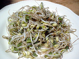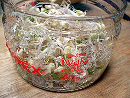 4月24日の夜に水に浸けた豆もやしが、5日後の4月30日にこんなになりました。