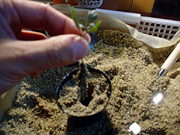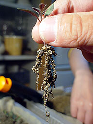 苗床(A4書類ケース)に入れた砂が浅く、根は底へ到達し、さらに不織布を突き破っていた。