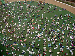 どこか別のところでやっているコンサートが映し出されているでっかいモニタを見つめる人々。