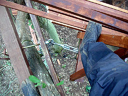 こちらからあちらの木にワイヤーを2本渡し、そこに前日作成した手すり付きユニットを設置して固定。