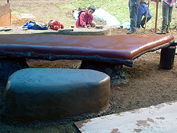 そのメルヘンな名前とは裏腹に、著名な左官職人さんの手ほどきを受けつつ全長数mの大壁とかまど2つ、砂利洗い出し仕上げの手洗い場、羽釜を設置できるおくど、そして日干しレンガと版築でこしらえたベンチと左官仕上げの大テーブルを土をこね骨組みを組み立てるところから作るという大工仕事。