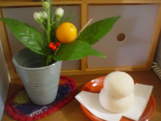 近所のお米屋さんで売られていた手製鏡餅と、サフさんが買ってきた正月っぽいアレンジメント。