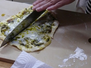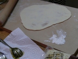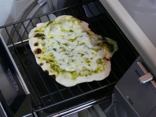 昨年ベランダで収穫したバジルを使ってバジルペーストを作ってあったので、それを生地に塗り、とろけるチーズをトッピング。