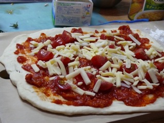 ついでに買い出しに行き、トマト缶、ニンニク、タマネギを使って、ピザソースを作成。