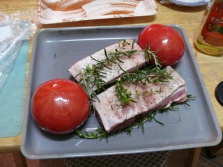 豚バラには、さっそくベランダから収穫してきてローズマリーとタイムをたっぷりと。