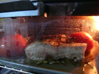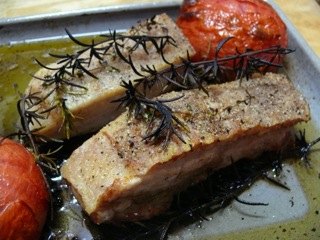 塩コショウをすり込んだ豚バラのブロックと、皮のついたままのトマトをまるごとのまま、天板に載せてオーブンへ。