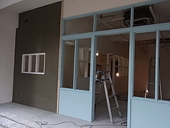 店内入口の木枠に色がつきました!ミントグリーンです。床は朱赤になって、ロゴは金色なので、大人な雰囲気が漂ういそうな感じです。